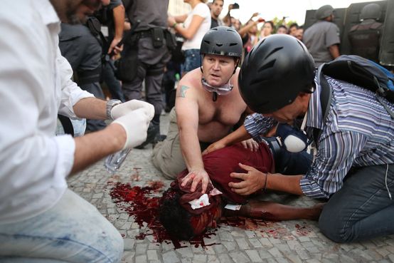 Dois jornalistas da BBC socorrem o cinegrafista Santiago Andrade, da Band, depois que um rojão atingiu sua cabeça.