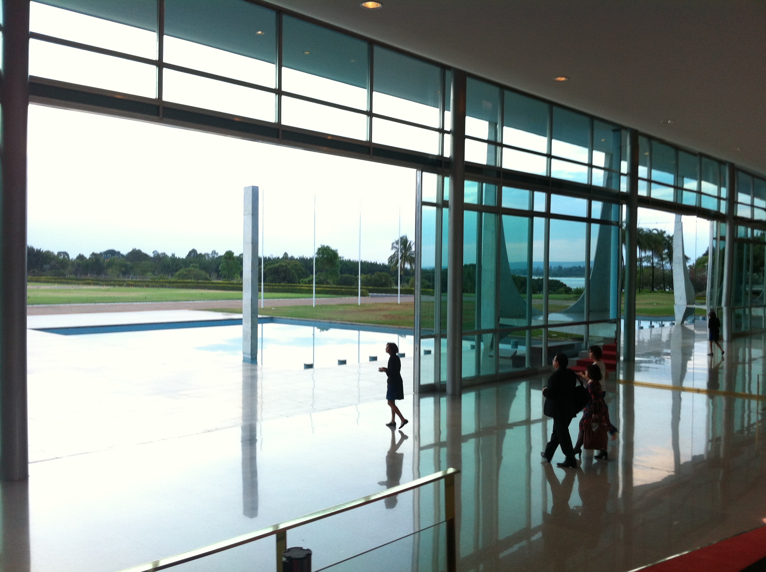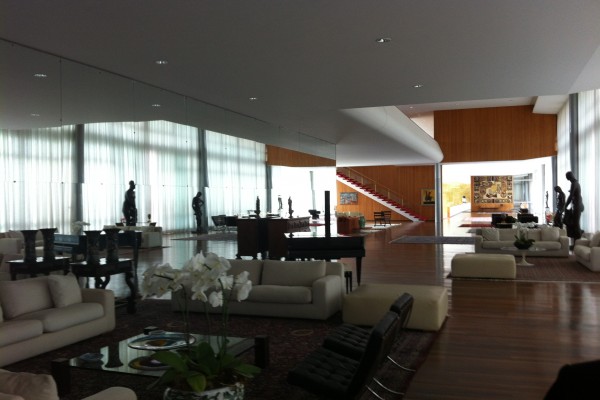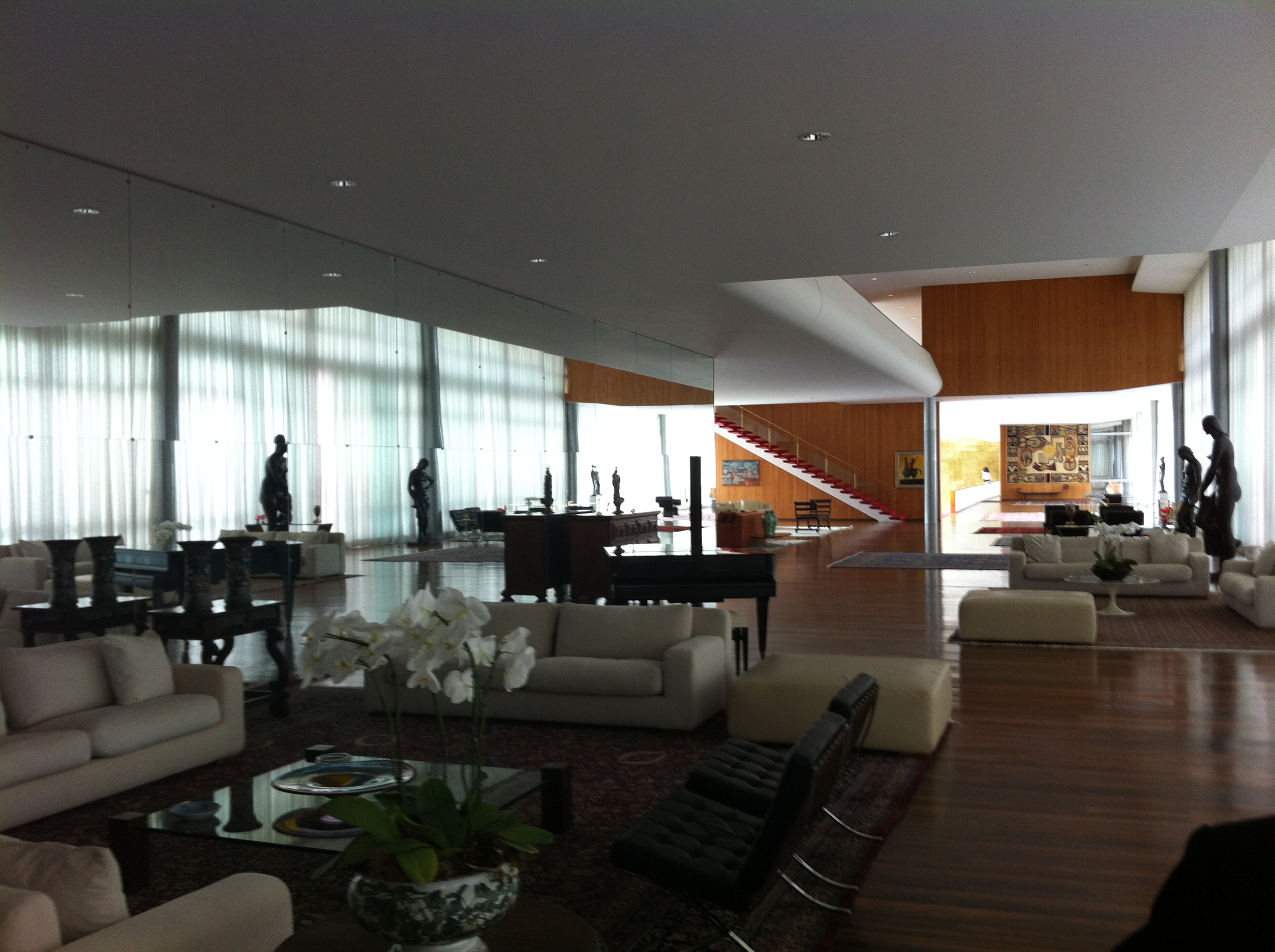 Nós aguardamos Dilma por 20 minutos, sentados à mesa de 16 lugares. Da entrada do palácio, com um espelho enorme que dá a sensação estranha de estar encontrando uma turma parecida vinda do nada (Paulo Moreira Leite disse que não consegue se acostumar com aquilo), até o salão onde ocorreu a conversa são mais ou menos 300 metros de ambientes com sofás, poltronas e mesas de centro.