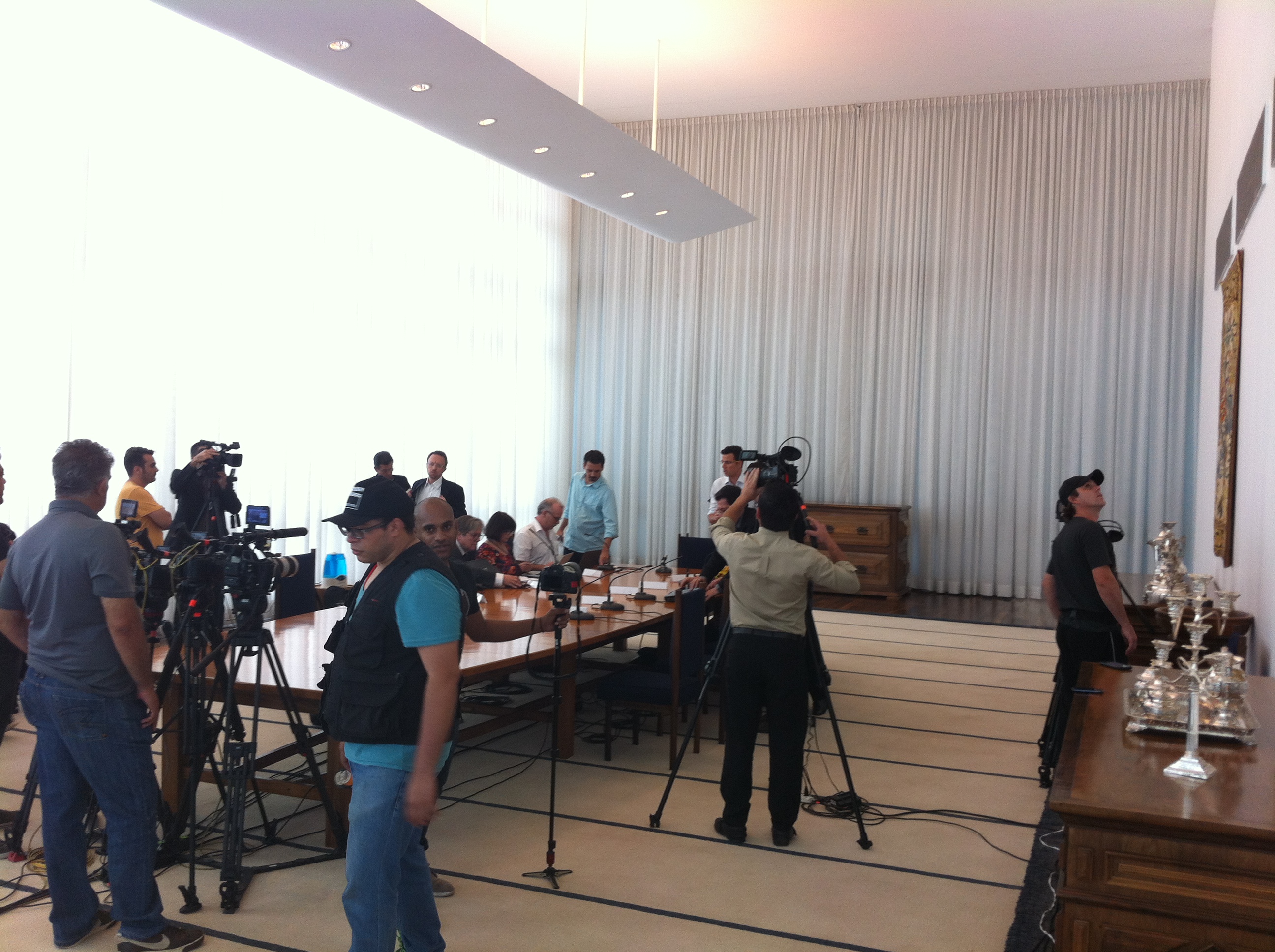 A entrevista terminou para outra começar. Em vans, jornalistas chegavam para a coletiva de todos os dias, naquele mesmo cômodo, com a candidata à reeleição.